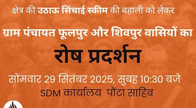 इसके साथ ही उन्होंने शमशेरगढ़ -बाँगरन, शिवपुर के लोगों से आह्वान करते हुए कहा कि गिरी तट के बाढ़ पीड़ितों के समर्थन, अवैध खनन के विरोध तथा क्षेत्र की सिंचाई स्कीम की बहाली को लेकर ग्राम पंचायत फूलपुर शमशेरगढ़ और शिवपुर वासियों का रोष प्रदर्शन आगामी