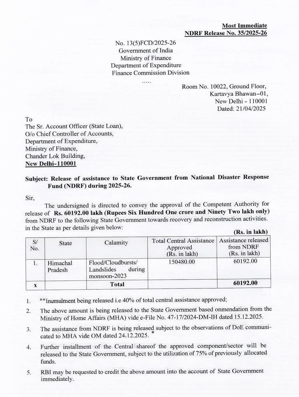 वित्त मंत्रालय के व्यय विभाग के वित्त आयोग प्रभाग की ओर से हिमाचल प्रदेश को कुल स्वीकृत केंद्रीय सहायता 1504.80 करोड़ रुपये में से 601.92 करोड़ रुपये की राशि जारी करने की अनुमति प्रदान की है। यह राशि एनडीआरएफ से राज्य सरकार को जारी की जा रही है। आदेश में कहा गया है कि यह सहायता गृह मंत्रालय की संस्तुति के आधार पर जारी की गई है। गृह मंत्रालय ने 15 दिसंबर को ई-फाइल के माध्यम से इसकी सिफारिश की थी। साथ ही यह राशि व्यय विभाग की ओर से 24 दिसंबर को जारी कार्यालय ज्ञापन में दर्ज टिप्पणियों और शर्तों के अधीन होगी।